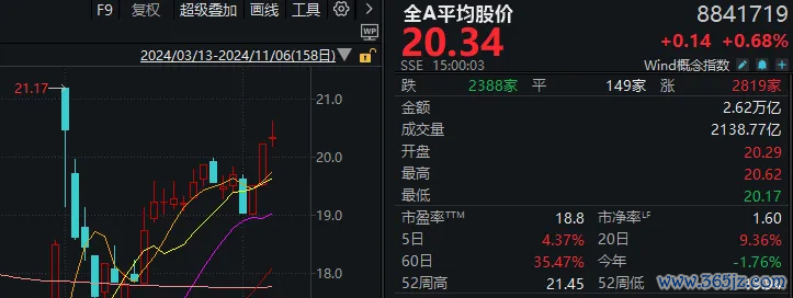 尽管三大指数集体收跌,但万得全A指数或全A平均股价均在昨日大涨的基础上,继续走强。